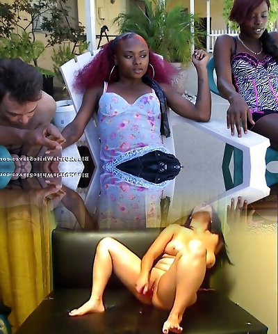 Horny white guy takes care of three pairs of ebony orbs