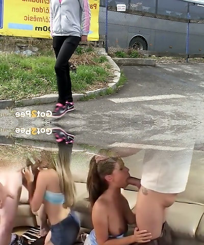 Heterosexual haired emo chick pulls down black jeans to pee at the bus parking