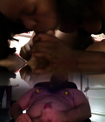 Bald bastard is licking her dark-hued twat