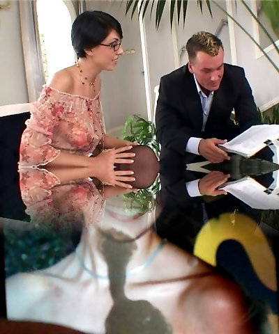 Impressive pallid brunette in glasses and pantyhose takes BBC in her holes